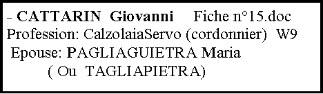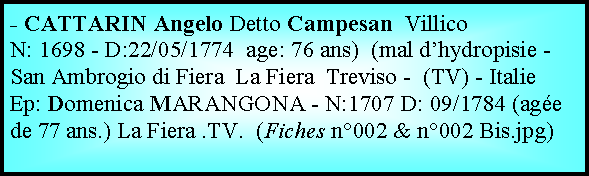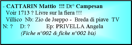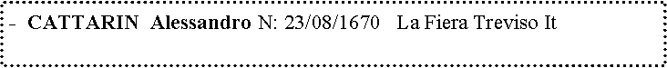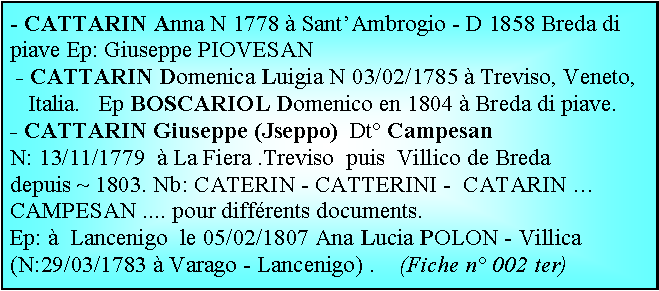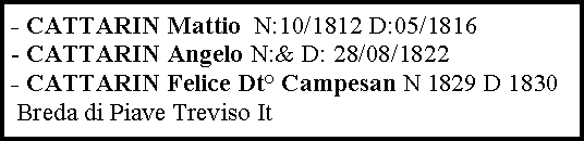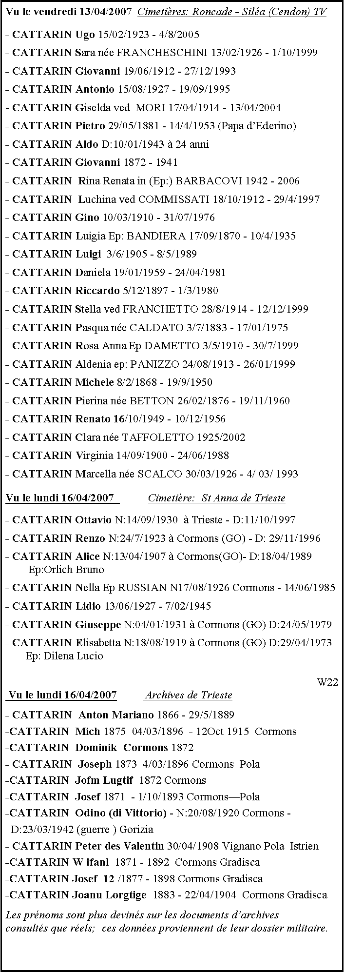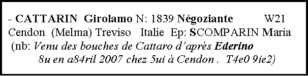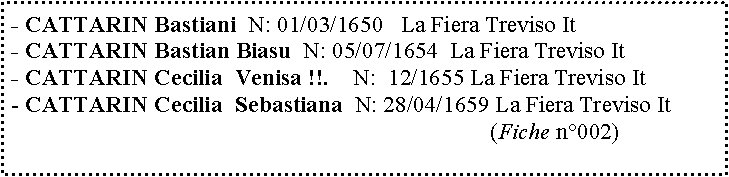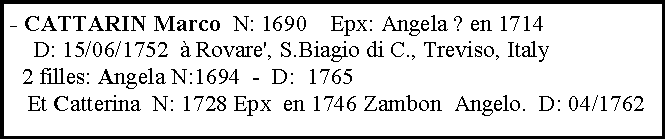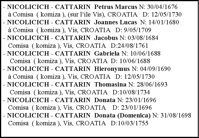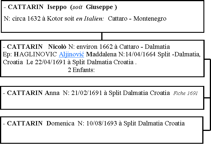 NB:Con questi documenti, possiamo vedere il “passaggio” del CATTARIN Nicolo a Cattaro nel 1662; poi, questi vivranno a Spalato (Split, Croatia) intorno al 1690, dove nasce Anna Cattarin, figlia di Nicolò Cattarin e Maddalena Haglinovic , poi nascerà un secondo figlio Domeniga Cattarin il 10 agosto 1693 a Spalato. Ricerca condotto da Alain CATTARIN detto Campesan . In Francia in 2021... File n° 1691 |
